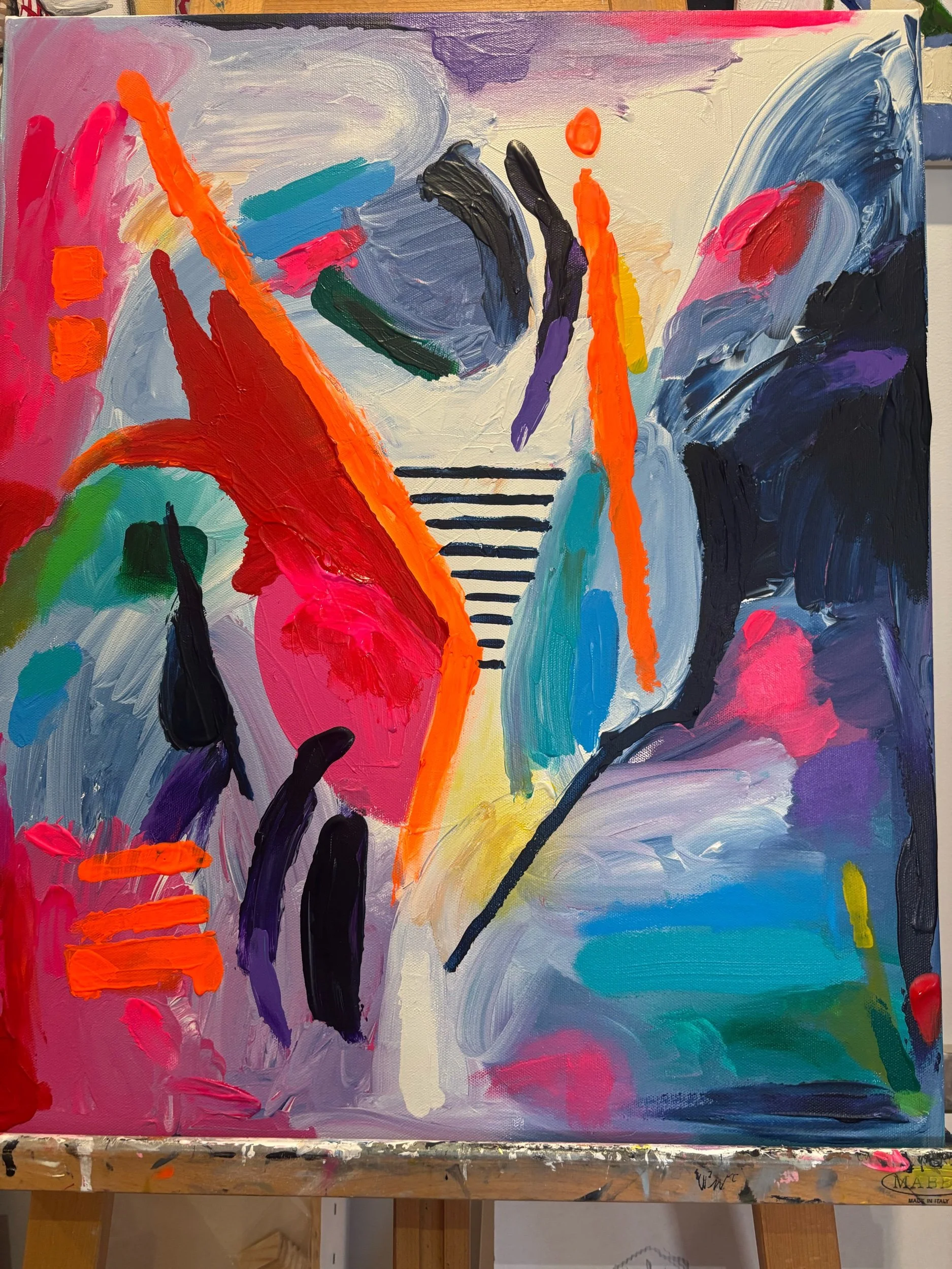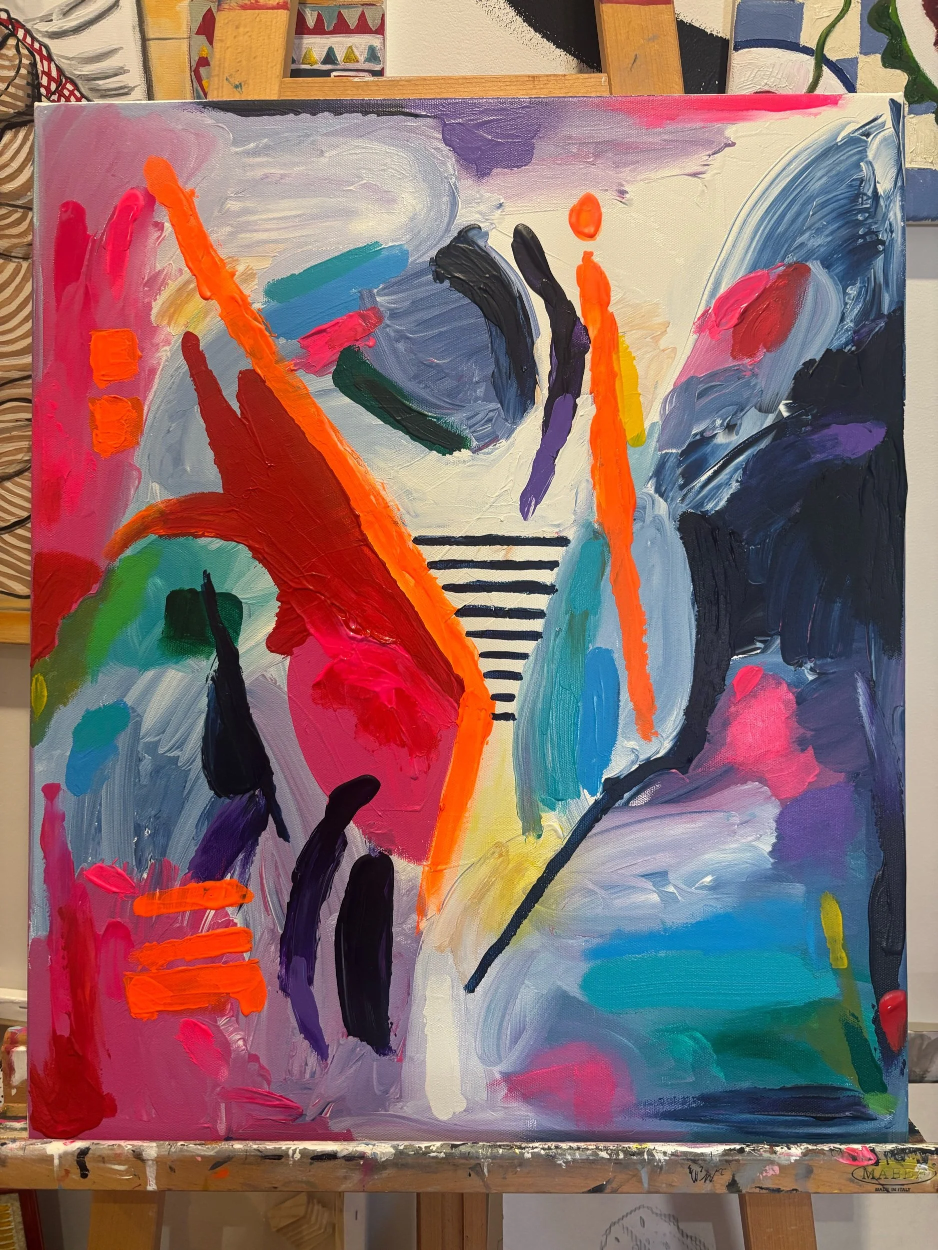 Featuring some softer pastels with bold primary accents the colours in here are complex and varied inviting the viewer to explore the tones within the piece. The shapes, lines and brushstrokes add elements of texture to further capture the viewers own thoughts and imagination as to what feelings this piece evokes. For me, it evokes joy.