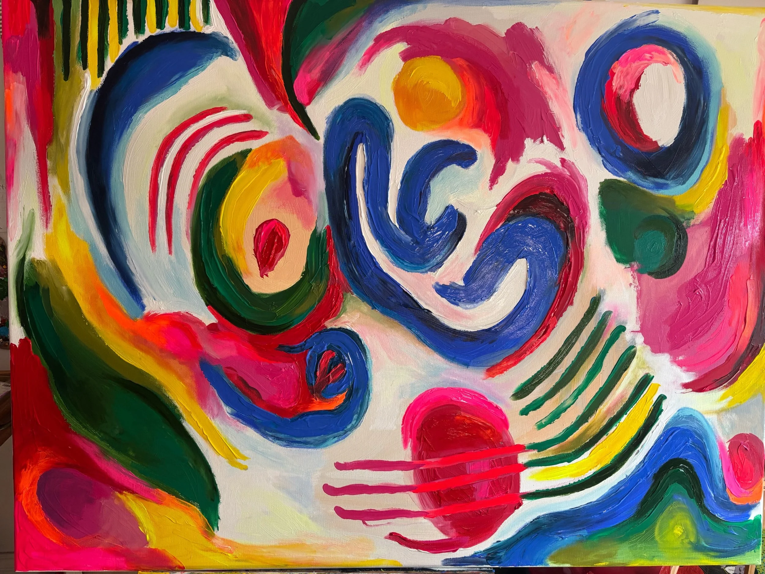 Inspired by the work of Miro this huge canvas suggests movement and shape. Primary colours fade into soft pastels.