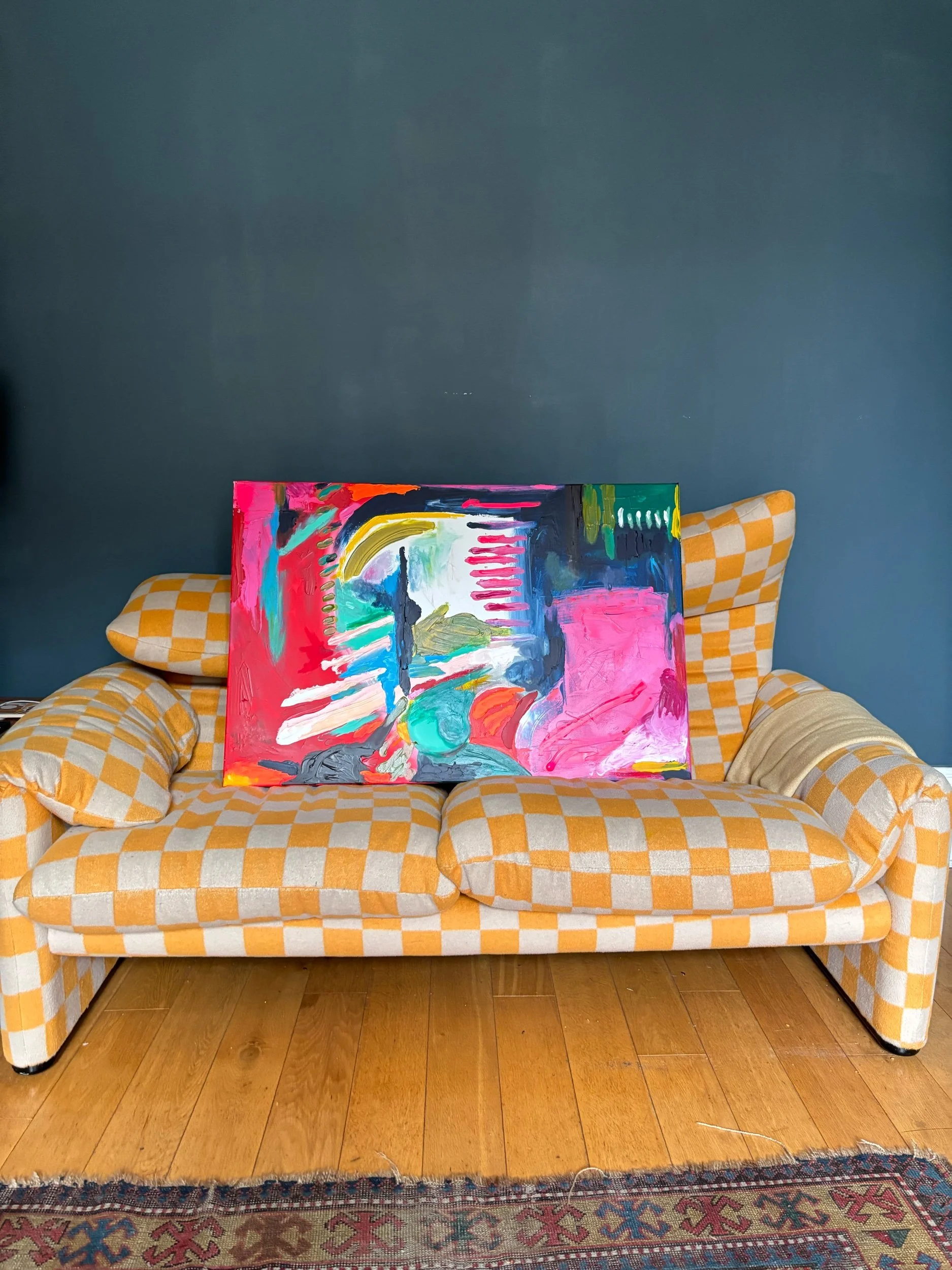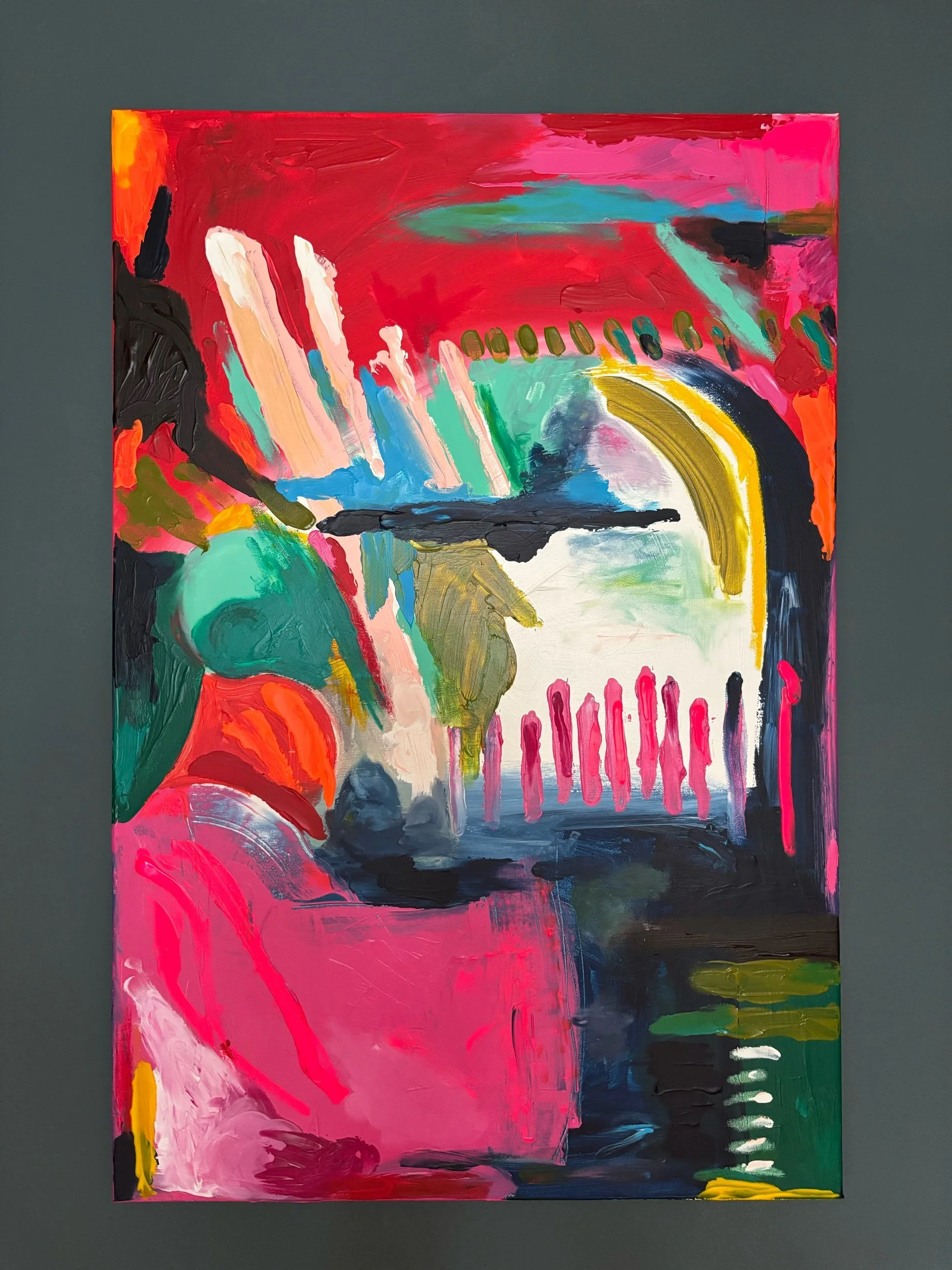 This large canvas features bold pattern and colour. Pinks, turquoises, greens and deep blues provide a joyful burst of colour. While the brush strokes, shapes and lines in the painting provide texture and depth. This work is sure to add energy to any space.