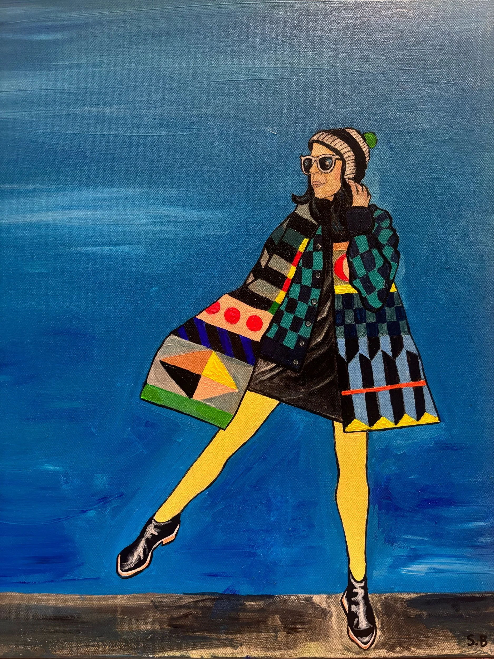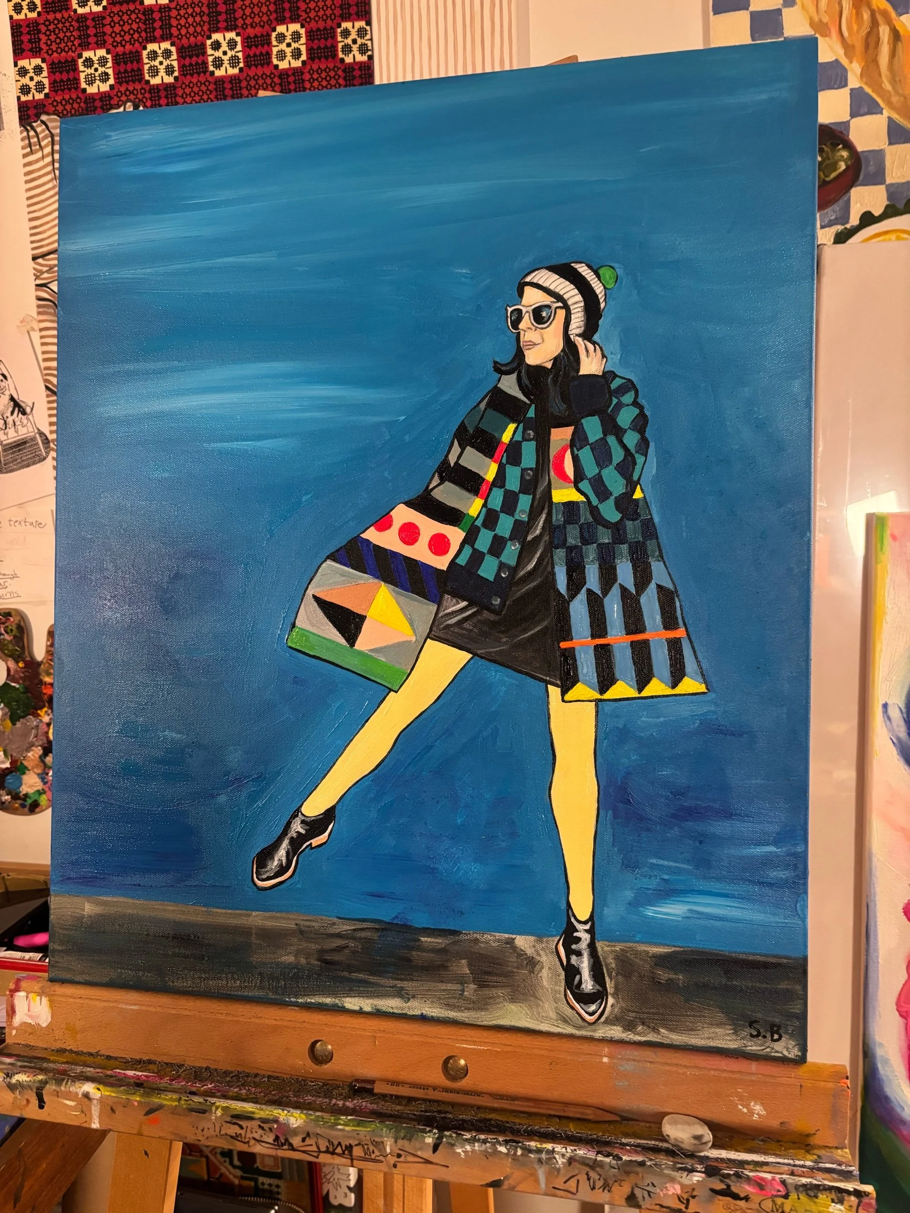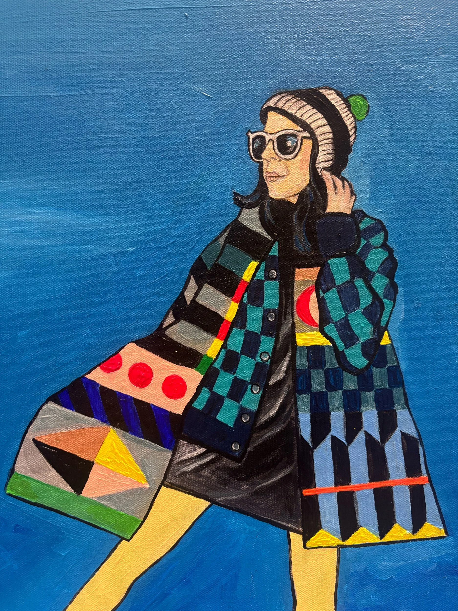 A beautiful blue background allows the mix of textiles in this portrait to pop in this original acrylic on canvas painting.